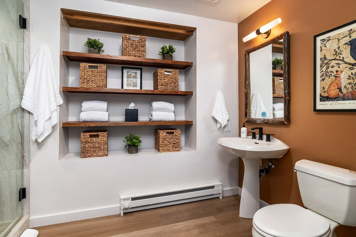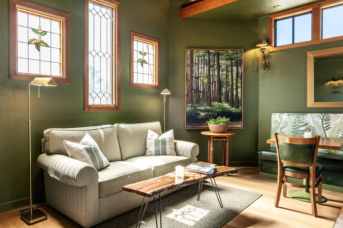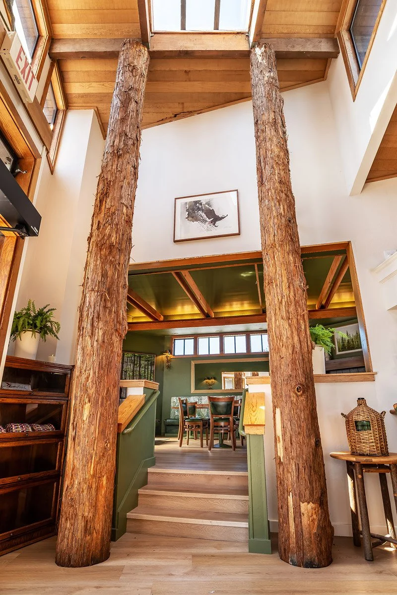 Every detail of the construction process emphasized authenticity and craftsmanship. We incorporated rich walnut and ash tones to establish a grounding visual foundation, while live-edge wood surfaces added organic movement and tactile appeal. The muted greens and soft browns used throughout the interior echo the natural surroundings and create a sense of continuity between the indoors and outdoors. Natural fibers, woven textures, and matte finishes complemented the raw materials, fostering a quiet elegance that feels both luxurious and sustainable.